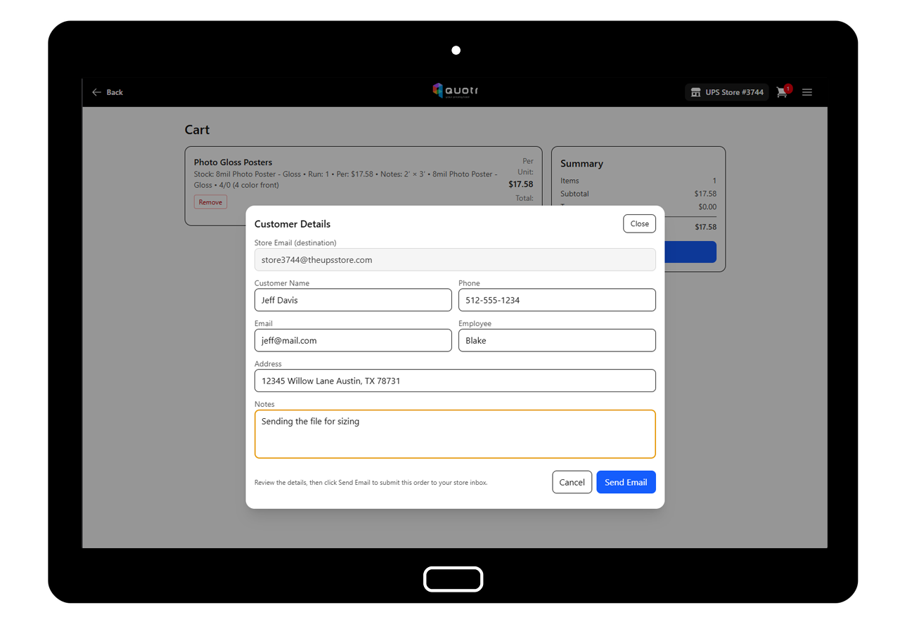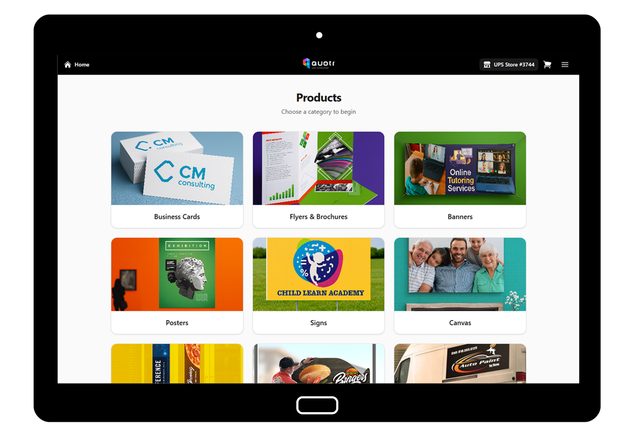 Quotr is a customer facing tablet app designed to give your associates the confidence to generate accurate print quotes on the spot. No more waiting for a print manager or emailing quotes after the customer has left the store. Select a product, enter the customer’s information, hit submit—Quotr emails your store a detailed order form. Your employee rings up the sale right away, all from the counter.