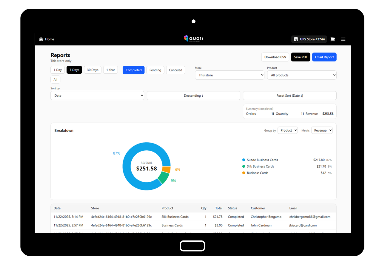 Be on top of your print game with Quotr's detailed reports page. Filter visual reports by Product, Date, Store, or Amount and discover what's working and what isn't.